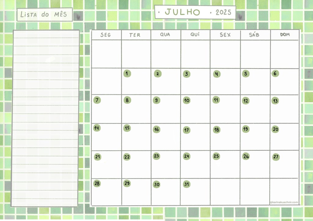 Sobre os desenhos: Para o calendário, aproveitei os anteriores e acrescentei camadas transparentes de lilás no aplicativo Procreate (Ipad). Ajustei as datas para o mês de julho e fiz o PDF.