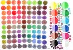 Depois do gabarito, resolvi fazer a paleta maior do lado esquerdo, com 9 colunas e 10 linhas de misturas. (Como o espaço era reduzido, deixei o verde escuro e o branco de fora.) Fui misturando cada cor com as demais na ordem de amarelo, laranja, vermelho, magenta, marrom, verde claro, azul claro, azul escuro, roxo e preto (na última fila). As cores principais formam uma diagonal que começa no canto superior esquerdo e termina no canto inferior direito (vocês podem ver que coloquei pequenos números a lápis nas cores puras nessa diagonal, para não me perder).