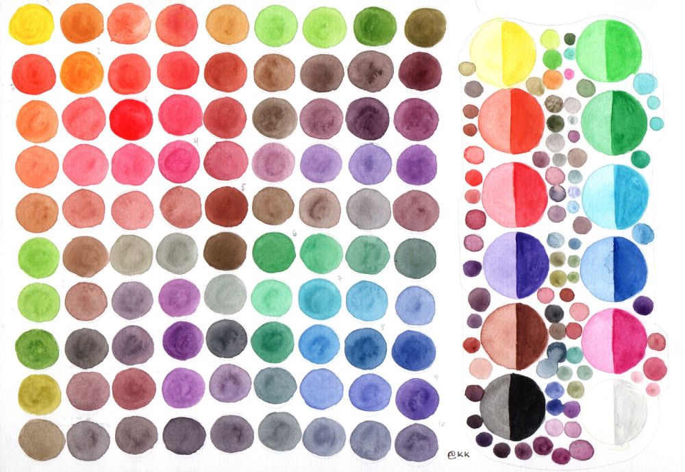 Como prometi ontem, segue a paleta produzida com o estojo de aquarela da Giotto (Acquarelli Mini), de 12 cores, do post anterior. Fiz as bolinhas a lápis primeiro, com ajuda de uma régua modelo, como a desenhada abaixo, só que toda de bolinhas vazadas. Comecei pelo gabarito do lado direito, reproduzindo as cores do estojo nas versões bem clara (aguada) e bem densa, para ter uma ideia da variação de tons de cada pigmento. Vou recortar esse gabarito para manter junto ao estojo, facilitando na hora de escolher a tinta. As mini-bolinhas em volta foram misturinhas que fiz nas combinações que costumo gostar.