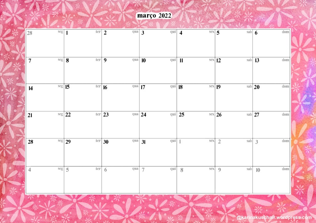 Nem vou me justificar muito para não atrasar esse post. Espero que ainda dê tempo de vocês curtirem o calendário e se planejarem. Bom março para nós! ♥